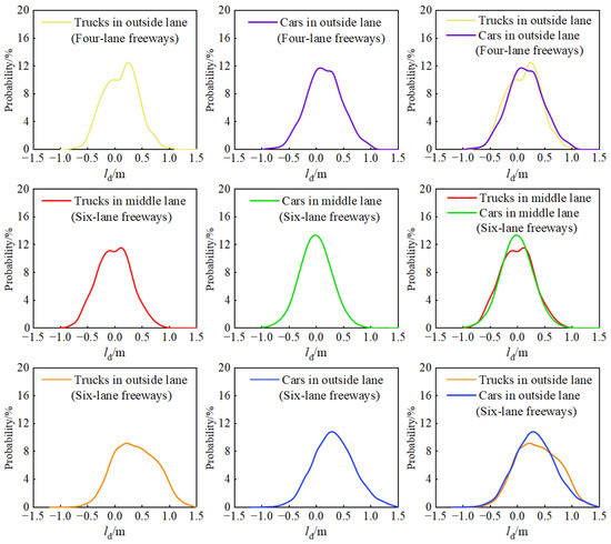 To clarify the differences between the operating characteristics of light-duty vehicles and large trucks, and to derive the key indicators of freeway suitable for light-duty vehicles, the motion behavior of both must be analyzed. To ensure that lane position and roadside environmental variables do not affect vehicle trajectory characteristics, the objects for comparative analysis are the mixed passenger and freight lane in two cross-sectional forms. Figure 13 shows probability curve combination diagrams of the preferred trajectory deviation of various vehicles in the lane, and Table 4 shows the statistical characteristic values of the preferred trajectory deviation of various types of vehicles in the lane.