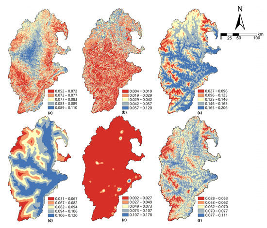 By referring to the relevant research results [37,47,48], the accuracy of data resampling is ensured, and the spatial differences of evaluation factors in the region are reflected through practices to improve the overall accuracy of the study. This paper uniformly resamples the acquired data to the grid unit of 500 m × 500 m in ArcGIS 10.2 platform, and the projection coordinate system is unified as “WGS_1984_UTM_Zone_48N”. Among those, Distance from Fault, Distance from Factories, and Distance from Counties are obtained based on Euclidean distance analysis in ArcGIS platform. All secondary indexes were preprocessed and normalized. Finally, the spatial superposition method of grid data is used to convert each evaluation index into the same spatial base, and the livability index corresponding to each grid is obtained with a map algebra operation. The main indicators and livability index are calculated as follows.