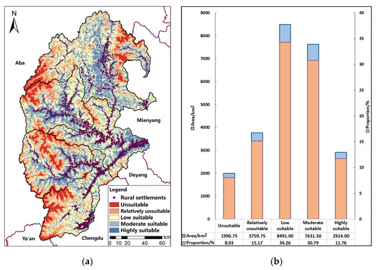 Livability of Rural Settlements in the Upper Reaches of the Minjiang River. (a) Comprehensive Livability Classification; (b) Livability Classification Statistics.