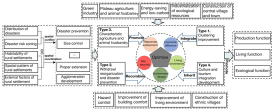 In order to address the problems of construction land expansion encroaching on surrounding villages, the scattered layout of rural settlements, and low efficiency of rural land use, relevant scholars often classify rural settlements into different upgrading types and propose corresponding optimization and upgrading strategies. The optimization of rural settlements can take two directions: one is to optimize the spatial hierarchical relationship of settlements and their governance system to form a clear hierarchical functional positioning [18,19,20]; the other is to explore the reasonable regulation and coordination of regional tertiary and biological space to identify various patterns of settlement development [21,22,23]. Long and Liu [24] divided the types of rural settlement reconstruction into three aspects, namely, spatial structure, economic structure and social structure reconstruction, which emphasized the key points of rural structural adjustment in China. Bi, et al., [25] proposed the reconstruction framework of rural settlements with an eye to regional ecology, production, and livelihood. However, Zhong, et al., reveled that geological hazards were the main driving force of mountainous settlement reconstruction by combining PRA with the structural equation model [26].