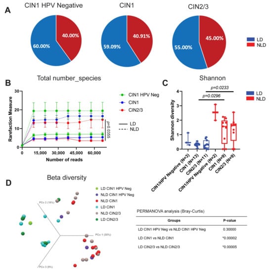 In this investigation, samples were separated into three categories: CIN1 HPV-negative, CIN1, and CIN2/3. CIN1 HPV-negative (40.00%) and CIN1 (40.091%) had comparable percentages of NLD samples, however CIN2/3 had a slightly greater percentage of NLD samples (45%) (Figure 2A). The alpha diversity based on the total number of species (Figure 2B) and the Shannon index (Figure 2C) was statistically distinct between the pairs of LD and NLD in CIN1 and CIN2/3, but not in the pair of CIN1 HPV-negative. These outcomes were identical to alpha diversity as measured by the Chao1 index (Figure S2B). Similar to the results of alpha diversity analysis, beta diversity analyses revealed significant changes in bacterial community structure between groups (Figure 2D).