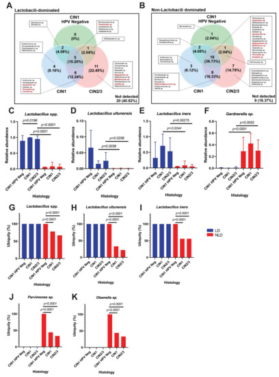 The number of unique genera in CIN1 HPV-negative, CIN1, CIN2/3, and shared between groups of LD and NLD is demonstrated in Figure 3A,B. In the LD group, 5 genera (10.20%) were shared in all histological groups (Figure 3A). In the NLD group, up to 18 genera (36.73%) were common in all histological groups, for example, Atopobium sp., Bifidobacterium sp., Bombiscadovia sp., Gardnerella sp., Prevotella sp., Sneathia sp., and Lactobacillus spp. (Figure 3B). Significant abundances of Lactobacillus spp., L. ultunesis, L. iners, and Gardnerella sp. were demonstrated in LD both in CIN1 and CIN2/3 when compared to NLD groups. No significant difference was found between CIN1 HPV-negative LD and NLD (Figure 3C–F). The differences in relative abundance of other bacterial species were established in Table S3. All LD groups had 100% ubiquity of L. ultunensis and L. iners, whereas the percentage of ubiquity in the NLD group decreased significantly as the disease severity increased (Figure 3G–I). Interestingly, Parvimonas sp. and Olsnella sp. were detected only in the NLD group with 100% ubiquity in CIN1 HPV-negative and significantly higher than HPV-positive groups (Figure 3J,K). The differences in ubiquity of other bacterial species are provided in Table S4.