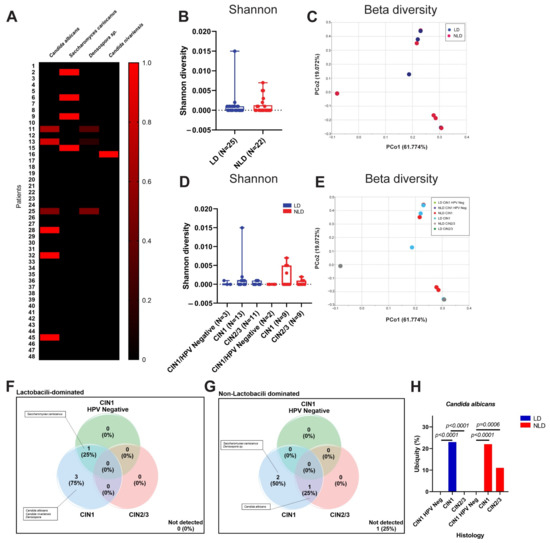 The 3.7 M of high-quality 16S/ITS reads were analyzed by BaseSpace Sequence Hub through the ITS Metagenomics Module. Only four taxa of the fungi were found, including Candida albicans, C. nivariensis, Saccharomyces cariocanus, and Densospora sp. (Figure 4A). Neither LD nor NLD nor histological groups showed a significant difference in fungal diversity (Figure 4B–E). The unique and shared fungal taxa among all sample groups are shown in Figure 4F,G. There was no significant difference in the relative abundance of any fungi across the groups (Table S5). C. albicans was not detectable in both LD and NLD CIN1 HPV-negative samples, but only in NLD CIN1, LD CIN1, and LD CIN2/3 samples, with a statistically significant difference (Figure 4H and Table S5).
