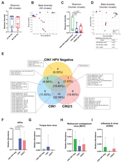 Eight species of human viruses (18.60%) were shared by all histological categories (Figure 5E), however certain viral species were exclusive to CIN1 HPV-negative, CIN1, and CIN2/3, such as Human adenovirus C, Hepatitis G virus, and Influenza A virus (H1N1), respectively. In addition, many types of Torque teno viruses (TTVs) were detected in many groups. Unexpectedly, a few HPV16 reads were detected in all CIN1 HPV-negative individuals (Figure 5F). Of these 5 samples, 3 were LD, whereas 2 were NLD. By exporting the reads and assembling them with the reference sequence, CLC Genomics Workbench 22 validated the existence of HPV16 in the five CIN1 HPV-negative groups. Then, at least three distinct sequences were blasted against the NCBI using the nucleotide collection (nr/rt) as the database. Nonetheless, the relative abundance of HPVs in HPV-positive CIN1 and CIN2/3 was considerably greater than in HPV-negative CIN1. The abundance of TTVs, Molluscum contagiosum virus (MCV), and Influenza A virus (H3N2) did not change significantly between groups (Figure 5G–I). The ubiquity of Influenza A virus (H2N2) was detected in CIN1 and CIN2/3 but not in the CIN1 HPV-negative group (Figure S4), but the ubiquity of other viruses, including Influenza A virus (H3N2) and TTVs, was comparable.