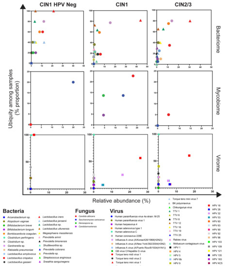 Ubiquity dot plot representing bacteria, fungi, and virus OTUs in the cervix with different histological characteristics. The graph was plotted between the mean of ubiquity (y axis) and relative abundance (x axis) of each OTU.
