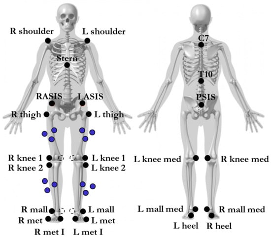 Cluster-based marker protocol with a 38 marker set. R shoulder, on the right acromion; L shoulder, on the left acromion; Stern, xiphoid process of the sternum; RASIS, on the right anterior superior iliac spine; LASIS, on the left anterior superior iliac spine; R thigh, on the center of the right great trochanter; L thigh, on the center of the left greater trochanter; R knee 1, on the lateral condyle of the right femur; L knee 1, on the lateral condyle of the left femur; R knee med, on the medial condyle of the right femur; L knee med, on the medial condyle of the left femur; R knee 2, on the lateral epicondyle of the right tibia; L knee 2, on the lateral epicondyle of the left tibia; R mall, on the center of the right lateral malleolus; L mall, on the center of the left lateral malleolus; R mall med, on the center of the right medial malleolus; L mall med, on the center of the left medial malleolus; R met, on the fifth metatarsal of the right foot; L met, on the fifth metatarsal of the left foot; R met I, on the first metatarsal of the right foot; L met I, on the first metatarsal of the left foot; R heel, on the right heel; L heel, on the left heel; C7, on the spinous process of the seventh cervical vertebra; T10, on the tenth thoracic vertebra; PSIS, on the mid-point of the right and left posterior superior iliac spine.