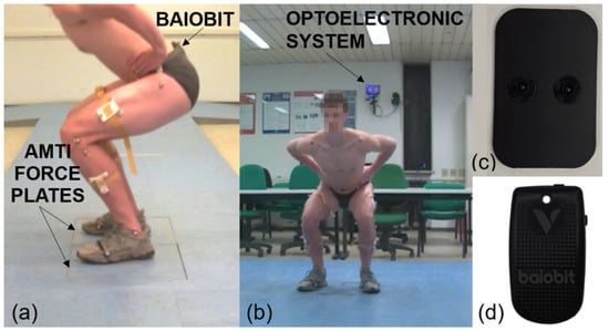 (a) Double-leg CMJ frame of the sagittal plane from the optoelectronic system with visible AMTI force plates; (b) double-leg CMJ frame of the frontal plane form the optoelectronic system with visible cameras; (c) bioadhesive plate; (d) Baiobit sensor (Rivelo Srl—BTS bioengineering Group, Milan, Italy).