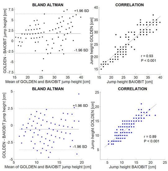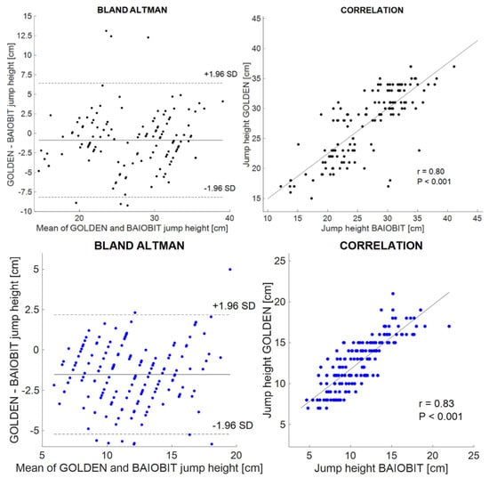 Moreover, the CMJ flights heights of the Baiobit and the optoelectronic system and force platforms were positively correlated; indeed, a high Pearson’s correlation coefficient was obtained (r = 0.80, p < 0.001 two-leg CMJs; r = 0.83, p < 0.001 single-leg CMJs) (Figure 4).
