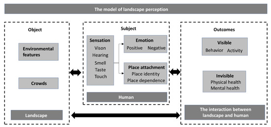 The current research has long discussed the public perception of parks [27]. Other than the perception of environmental features [16,17], positive and negative perceptions have also been taken into consideration in recent research on urban park perceptions [21]. To make the study more reliable, researchers used a health model based on the person-environment-health relationship in the qualitative study of park users’ visit motivation and derivative effects [28]. Previous studies focus only on the influencing factors that affect users’ perception of parks, through which we are difficult to deeply understand the complex process of interaction between park users and the landscape. However, the theory of landscape perception is the classical theory that focuses on the cyclical and interactive process of perception [25], which can help us delve into young adults’ interactive perception of the landscape in urban parks. Therefore, this research constructs a landscape perception model based on landscape perception theory. It combines with human environmental and cognitive processes and the connotative characteristics of spatial perception [29] to provide a theoretical basis for qualitative research on urban park perception, which can help systematically understand young adults’ landscape preferences for urban parks. This model (Figure 1) is divided into three parts: landscape, human, and human–landscape interactions, each of which are explained in detail as follows.