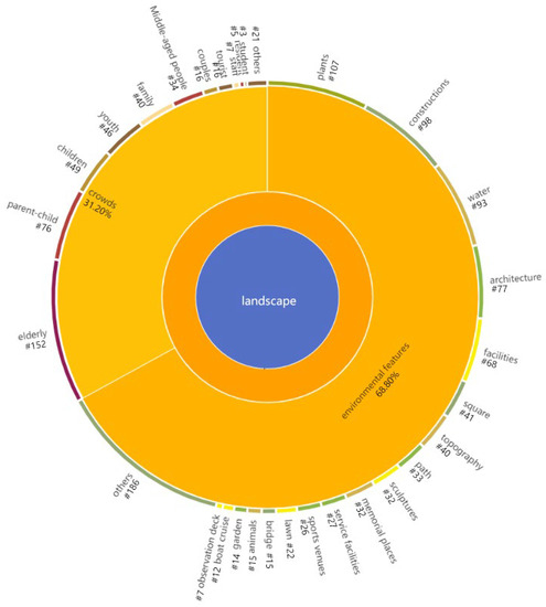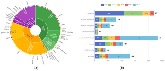 In our research results, the participants’ subjective perceptions (“human”) accounted for the largest share of codes, accounting for 41.76%. The perceptions of landscape objects (“landscape”) accounted for the second-largest share of codes, reaching 38.69%. The perceptions of “the human–landscape interactions” accounted for the smallest share of codes, accounting for 19.55%. In the breakdown, the participant’s perception of the landscape environment features was the most coded, and the sensory perception (visual, hearing, smell, etc.) was the second most coded. On the other hand, the participants generated the least perceptions about place attachment and health, as shown in Figure 3a.