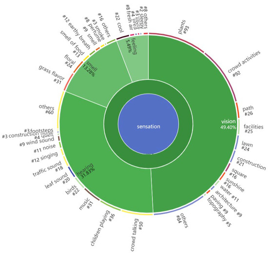 The research found that in the sensation by which young adults perceive the external environment, the largest proportion is visual (49.40%), followed by hearing (31.83%), smell again (13.28%), and body feeling at the bottom (5.49%), and there is almost no code about taste. Overall, the proportion of hearing and smell in our research is much higher compared to other research studies, as shown in Figure 5. We also found that young adults’ multiple sensory perceptions are more concerned about the natural landscape, such as the visual codes of plants, the hearing codes of the sound of leaves, and the smell codes of the smell of grass and flowers. Additionally, young adults’ multiple senses are also sensitive to active crowds, such as vision codes for crowd activity, hearing codes for crowd conversations and children playing, and smell codes for crowd smell and perfumes.