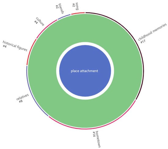 Place attachment in our research was often expressed as place identification [63] with memories and emotions of hometown, childhood, and relatives, while place dependence was rarely identified. In most cases, such factors have emotional connections with places as they recall their memories and life experiences, which are often closely related to the people they are concerned with and the resulting positive emotions [40]. Furthermore, such emotional bonds act as the intersection of users’ personal experiences with places [37], while there is less identification with and a sense of belonging to local culture.