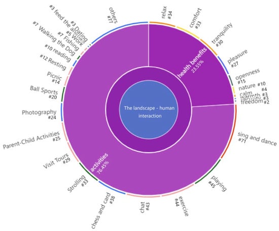 The codes of crowds’ activities account for the majority of the human–landscape interaction with various types of activities. At the same time, we often see enjoyable feelings such as “relaxation”, “comfort”, “tranquillity”, and “pleasure “ in the interviews. These states are often difficult to perceive, but they are also the health benefits and wellbeing that come from the landscape perception of urban parks.