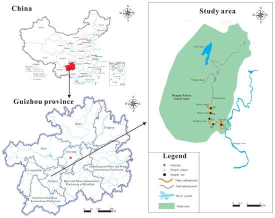 Karst caves refer to natural underground spaces formed by the long-term dissolution, erosion, and gravity collapse of soluble rocks by groundwater []. It is an essential subsystem of the terrestrial natural environment, helping ensure the continued health of local ecosystems and the survival of the species that depend on it [,]. Due to a deficiency in surface water, karst groundwater is one of the region’s primary drinking water sources, and in fact, karst groundwater provides more than 70% of the drinking water in rural areas with dispersed water sources []. Karst cave water is special groundwater and an important part of regional water circulation; moreover, most karst caves in China lack effective protection [], so the ability of karst groundwater to purify itself us relatively low and susceptible to outside pollutants. It is likely to become a natural enrichment place for all pollutants [,,].