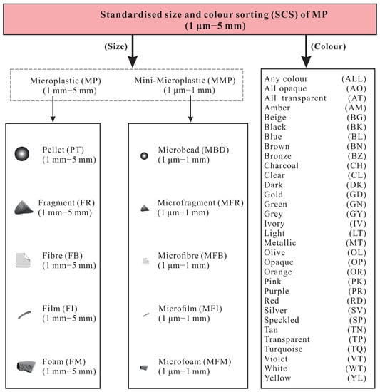 Water filtration flotation was measured with a handheld electron microscope (Dino-Lite AM3011T) with Dino Capture 2.0 software, and MPs were measured by Image J software (1.46r, National Institutes of Health, Bethesda, MA, USA) and classified according to the standard size and color classification system (SCS), as shown in Figure 2. We used a μ-Roman spectrometer for qualitative analysis of MPs and compared the standard spectra of six typical plastics (PA, PS, PP, PP, PE, PET, and PVC). When matching degree ≥70%, the material was identified as this type of plastic. Non-six typical plastics were classified as other component MPs.