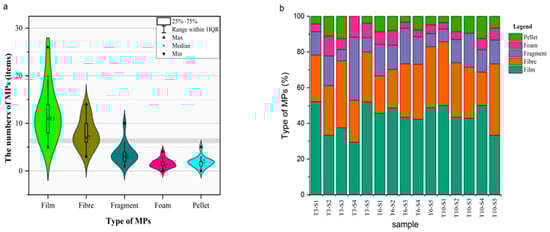 The type of MPs: (a) abundance of MPs in different shapes and (b) proportion of microplastic type.