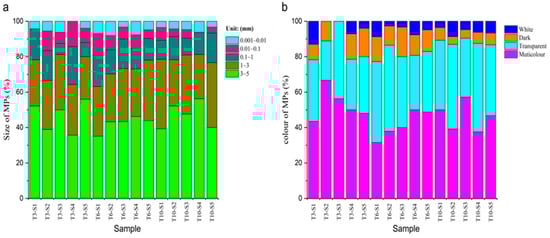 In the 15 water samples, the size of MPs was mainly 3~5 mm, accounting for 44.20%, and the number of MPs gradually decreased for sizes of 1~3, 0.1~1, 0.01~0.1, and 0.001~0.01 mm accounting for 29.88, 13.83, 6.91, and 5.19%, respectively, as shown in Figure 4a. This indicated the gradual decomposition of large-sized plastics to small-sized MPs.