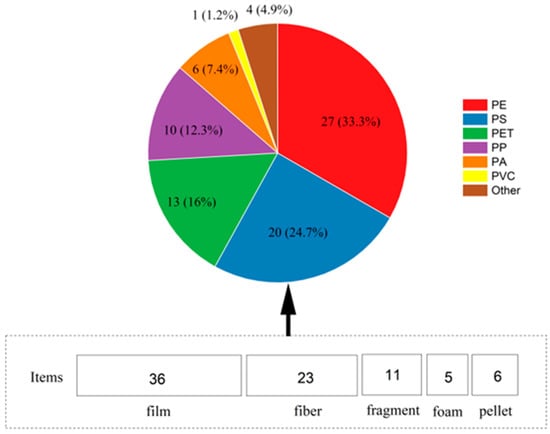 In the study, 81 samples of MPs of different types from 15 water samples (including 36 film, 23 fiber, 11 fragment, 5 foam, and 6 pellet samples) were randomly selected for μ-Roman determination. The results showed that the main components of microplastic films in karst groundwater were PE, followed by PS and PET; the main fiber polymers were PET, PA, and PP; fragments included PS and PA, foam was PS, and pellet was primarily PP and PE. The measurement results showed that out of the 81 microplastic samples, 4 other MPs were used, accounting for 4.94%; their main components were polyurethane and styrene butadiene rubber, as shown in (Figure 5).