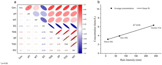 Relationship of microplastic abundance with water physicochemical properties and rain intensity. (a) water properties and (b) rain intensity.