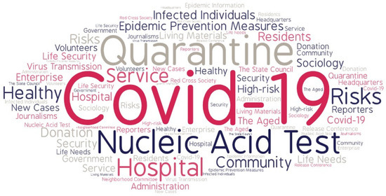 This study selected the information related to the COVID-19 from the four information sources published by PODC from 1 January to 31 March 2022, involving 75 relevant texts, with a total of 74,360 words (using big data analysis, the high-frequency words as shown in Figure 2 and Table 1). For example, as shown in Table 2, the online public opinions related to COVID-19 of the main network platforms from 25 to 31 March 2022 released by PODC were selected. First, the representative WeChat official account tweets about COVID-19 were selected for analysis, such as “children dance for epidemic prevention workers to thank, netizens: it’s better to get home quickly after finishing” (28 March 2022) [36]. Secondly, the representative posts of major online communities, such as “Cap the cost to make COVID-19 antigen testing more affordable” (28 March 2022), were chosen for analysis [37]. Thirdly, the representative Sina Weibo’s reports on COVID-19 were selected for analysis, for example, “a nurse in Shanghai died of asthma: the emergency department of Shanghai Oriental Hospital was temporarily closed due to epidemic disease” (25 March 2022) [38]. Fourthly, we selected the popular search contents related to the COVID-19 from the search engine, such as “Changchun apologizes to the public for the difficulty of buying vegetables: we have organized multi-channel efforts to increase stock” (29 March 2022) [39]. The samples were selected mainly for the following reasons: (1) these online public opinion events are all related to the COVID-19, which have aroused widespread concern and discussion in China, and have a huge impact on society. (2) These cases are highly typical and representative. They are all data collected by PODC through heat filtering and targeted capture, and they are ranked in the top ten of the weekly ranking according to the attention index published by PODC. (3) In terms of data availability, these data are from official media and influential We Media, including academic research results, expert analysis, public comments, party interviews, stakeholder interviews and other key data, which provide sufficient data for this study.