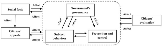 Theoretical coding is the process of further generalizing the obtained categories to form a theory through induction and innovation. Through the analysis of six categories, it was found that the number of concepts contained in “citizens’ appeals”, “subject behaviors” and “prevention and control measures” ranked in the top three of the six categories, accounting for 64%, and became the most important part of the online public opinion system. The evolution of the whole online public opinion event is inseparable from the dynamic relationship between these three categories. Citizens’ appeals are an important part of the epidemic prevention and control that can directly reflect the opinions of the majority of netizens. Online social media has become a platform for social management and for netizens to express their opinions and intervene in public affairs. Whether the citizen’s appeals, discovered from online public opinion, can be effectively responded to is related to the effect of social governance. The subject behavior includes the behavior of different organizations and individuals in the context of the epidemic, including legal behavior and illegal behavior. These behaviors have a direct or indirect impact on social order and the effectiveness of epidemic prevention and control in the context of the epidemic. The behavior of different subjects will affect the way the government is governed, as well as the evolution of specific prevention and control measures. Epidemic prevention and control measures are usually specific actions taken by relevant government departments and personnel, and are a dynamic behavioral system. Good prevention and control measures will have a positive effect on citizens’ appeals and subject behavior.