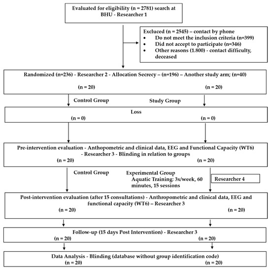 Design and flow chart of clinical trial participants. BHU: Basic Health Unit; EEG: electroencephalogram; WT6: six-minute walk test.