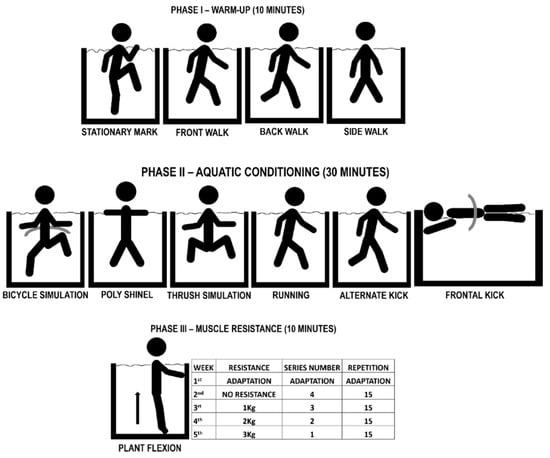 The water-based physical exercise program was composed of four phases: I warm-up (10 min), II aquatic conditioning (30 min), III muscle resistance (10 min), and cool-down/relaxation (10 min) (Figure 3).
