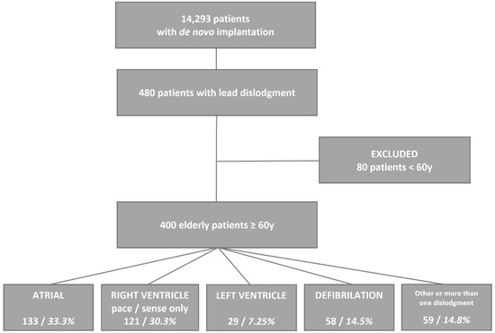A total of 14,293 patients were hospitalized between 2008 and 2021 in the Electrocardiology Department for de novo CIED implantation, including PM, ICD, and CRT. The data of 480 patients with lead dislodgement were entered into the retrospective registry, and a group of elderly patients aged 60 or older was selected. The study design and patient selection are summarized in a flowchart in Figure 1.