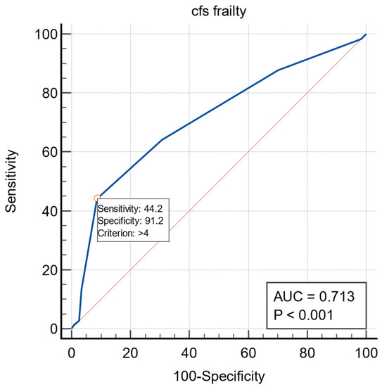 The ROC curves for frailty and early dislodgement are presented in Figure 5. The area under the curve was 0.695 (95% CI: 0.629–0.756). The cutoff value for recognizing frailty was 4 (p < 0.0001).