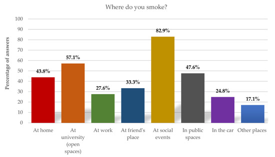 Identifying the place where tobacco/nicotine products are usually consumed also allows the characterization of their consumers. In this way, and given that several answers were possible, we could see, as can be perceived in Figure 1, that the places where tobacco consumption is more notorious are social events (parties, bars, clubs) in the first place, with 82.9% of responses, university outdoor spaces in second place with 57.1% and home in third place with 43.8%.