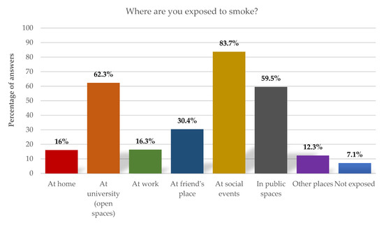 In addition, when we identified the spaces where environmental exposure takes place (also here multiple answers were possible) we notice that the most mentioned places are social events (parties, bars, clubs) with 83.7% of responses, the university (open spaces) with 62.3% and public spaces such as parks with 59.5%. Only 7.1% of respondents say they are not exposed to tobacco product smoke (Figure 2).