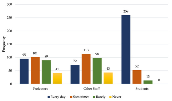 We, similarly, wanted to know how often students saw professors, staff or other students smoking at the entrance to the buildings in the spaces of the university campus. We similarly verified here that the percentage differences between the two genders were minimal, and, as can be seen in Figure 3, the group that is most often seen smoking at the entrance of buildings is students.