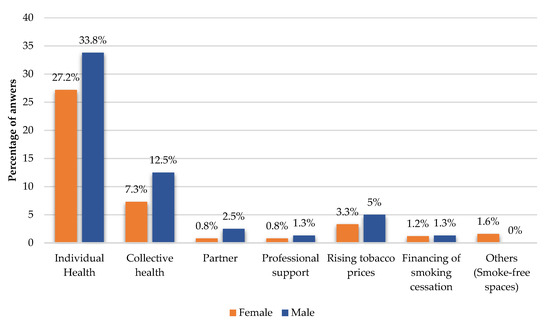 Regarding the sources of motivation for smoking cessation, we found that individual health and collective health seem to be the main reasons for quitting smoking, followed by the increase in tobacco prices; although we did not find significant differences between genders here, males presented higher percentage values in these three points. Particularly, individual health appears consistently, throughout several studies, as a motivation to quit smoking [30,31].