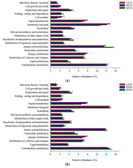 A total of 18 metabolic pathways in level 2 had a relative abundance greater than 1%, of which amino acid metabolism (11.47–13.52%), carbohydrate metabolism (11.92–13.03%), and membrane transport (10.67–12.86%) accounted for the highest proportions compared with other pathways (Figure 6). The relative abundance of amino acid metabolism was markedly lower in LT and HT than that in NT at 0–20 cm, whereas the relative abundances of membrane transport and cell motility exhibited the opposite trend. The relative abundance of signal transduction at 20–40 cm was markedly lower in NT than in LT and HT (p < 0.05). Other functional metabolic pathways did not differ significantly among the three peatlands at each depth.