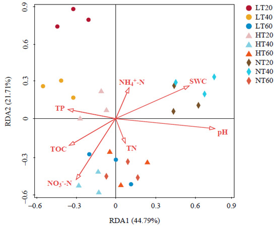 Redundancy analysis (RDA) of the relationship between soil physicochemical properties and bacterial community structure. TOC: total organic carbon; TN: total nitrogen; TP: total phosphorus; NH4+-N: ammonium nitrogen; NO3−-N: nitrate nitrogen; SWC: soil water content.