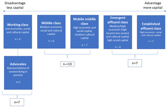 Women who consumed alcohol but expressed interest in exploring reducing alcohol (having a ‘sober curiosity’) were recruited through a targeted Facebook advertisement that asked ‘are you sober curious?’, ran for 2 weeks and was released in February 2022. This coincided with ‘FebFast’ and the advertisement was released while FebFast was being advertised online. Initially, 30 women were recruited, but one became unable to participate after contracting SARS-COV-2, another withdrew due to a significant life event occurring, and one was lost to follow-up after completing the social class survey, resulting in 27 participants. In addition to individual interviews, two interviews were conducted with representatives from advocacy groups for women to speak on behalf of women who are single mothers and who live in poverty, this was because of limitations in access to women living with such experiences. To explore the notion of sober curiosity as it relates to class, we sampled for women with access to different levels and compositions of several forms of capital—economic but also social and cultural resources per Bourdieu’s sociological model of class [47]. To measure women’s social class positionings, we operationalised a novel sociological approach recently validated in the UK [48] and Australia [49] and our previous study [13,14]). This approach extends beyond simple economic, employment, and educational markers and has contemporary relevance to the nuances of social class divisions and consumer behaviour that extend to the social and cultural dimensions that shape life chances and alcohol-related outcomes. We have provided detail about the survey tool we adapted from Sheppard and Biddle’s survey of Australian’s social class in 2015 and shown its value for seeing social class in data on women’s alcohol consumption behaviours elsewhere [8]. The survey tool measures social class across three domains: economic capital was measured as income, property and assets, social capital was measured by social contacts and occupational prestige of women’s social networks and cultural capital was measured by the level of women’s participation in various cultural activities. To determine economic capital, assets was measured by combining responses to the questions: what is your annual income before tax or anything else is taken out? (responses were indicated by income brackets provided); what would you say is the approximate value of the property owned or mortgaged by you, and roughly how much do you have in savings? (<$20,000; $20,000 to <40,000, $40,000 to <60,000, $60,000 to <80,000, $80,000 to <100,000, $100,000 to <150,000 and $150,000 or more). Social capital was measured by totaling the number of a range of known occupations within the respondent’s social contacts (i.e., yes = 1) and the average prestige of those occupations. Occupational prestige was assigned using the Australian Socioeconomic Index 2006—a validated index for occupational prestige for the following occupations: secretary, nurse, teacher, cleaner, university lecturer, artist, electrician, office manager, solicitor, farm worker, chief executive, software designer, call centre worker, and postal worker. Cultural capital was measured by a count of “highbrow” and “emerging” cultural activities (where 1 = yes) per Bourdieu’s description of cultural tastes. Respondents selected activities they had engaged in within the 12 months prior to completing the survey from a list of cultural activities including: seen plays or gone to the theatre, watched ballet or dance, gone to the opera, gone to museums or galleries, listened to jazz, listened to classical music (classified as “highbrow”) and listened to rock and/or indie music, attended gigs, played video games, watched sports, exercised or gone to the gym, used Facebook or Twitter, done arts and crafts, socialised at home, listened to rap music (classified as “emerging”).