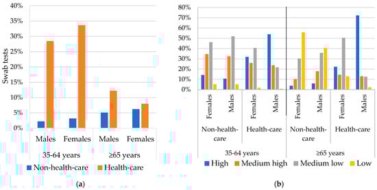Comparison between healthcare workers and non-healthcare workers regarding (a) access to swabs by age and gender; (b) distribution of population according to educational level, by age and gender individual Index of Socioeconomic Disadvantage (ISD).