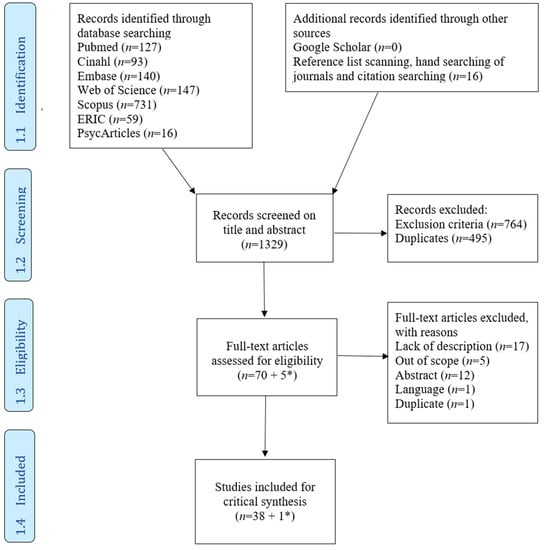 The Rayyan online screening tool was used to import the records identified during the second literature search and allow blind screening of the title and abstract [28]. After removal of duplicates (n = 495), the screening was carried out independently by the first and last author, which led to the exclusion of 764 records not meeting the inclusion criteria. Rating conflicts (n = 29) pertained to articles that either mentioned an identity of organizations in a collaborative setting or discussed a scale to measure team identity. It was decided to retain these articles. The percentage agreement (96.5%; >75% recommended) and Cohen’s Kappa (0.64; >0.61 recommended) were calculated with the ReCal online tool to determine inter-rater agreement in relation to the screening and selection of outcomes [29,30]. Next, 70 out of the 1.329 articles eligible for full-text screening were imported in Endnote X9 citation manager and screened independently by both authors. This screening led to the inclusion of 38 out of 70 articles with a high inter-rater agreement of 83% and a Kappa of 0.65. Rater conflicts (n = 13) mostly resulted from ambiguities in concepts or unclear reporting in the articles but were resolved after discussion. As all benchmarks were met, the third literature search and screening of 32.192 records on the base of the title and abstract were further continued by the first author. This screening resulted in five additional articles eligible for independent full-text screening by both authors, resulting in one extra article meeting inclusion criteria. In total, 39 articles were included for analysis and 36 out of 75 were excluded (see Table S4 for excluded studies [31,32,33,34,35,36,37,38,39,40,41,42,43,44,45,46,47,48,49,50,51,52,53,54,55,56,57,58,59,60,61,62,63,64] with related rationale). The PRISMA flowchart (Figure 1) represents the results of the second literature search with the results from the third literature search, which have been added by means of an asterisk.