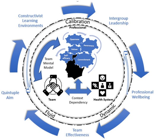 The present Results and Discussion section constitutes the synthesizing argument, starting with a graphical representation by means of the established conceptual framework (Figure 2). This figure depicts the synthesized higher order themes resulting from the critical theoretical analysis of the attributes, antecedents and consequences as well as shows their interrelatedness. Accordingly, we explore these higher order themes step-by-step in the next paragraphs to provide an integrated discussion of the complexity of IPI, where we go beyond a simple descriptive approach of the isolated themes shown in Table 1. We start with elaborating on the content-related features of IPI—central in the figure—comprising the values, awareness, openness, self-efficacy and commitment at the level of a professional. Afterwards, we discuss the structural properties—within the inner circle—by emphasizing the context-dependency of IPI in relation to the health system and by focusing on the congruency within a team through the development of a team mental model (TMM). We then comment on the continuous development of IPI in a fluid and dynamic way and through calibration, which is inferred by the inner ring. The antecedents—above the circle—further help us to operationalize adequate IPI-fitting constructivist learning environments (CLE) based on collaborative, constructive and contextualized learning principles. Additionally, they inform us on the importance of intergroup leadership in addressing conditions and contextual characteristics that enable IPI development—hence the permeable inner lines—through educational redesign and by constructing an interprofessional CoP. Ultimately, these antecedents may lead to several consequences—shown in the lower half—with regard to professional wellbeing, team effectiveness and the quintuple aim, which will be explored accordingly. In turn, these consequences are believed to impact the antecedents as well as exert influence on the development of IPIs, again emphasized by the permeable barriers. This synthesizing argument will then be followed by an examination of the measurability of IPI by means of defining the empirical referents to inform us of effective assessment practices. Lastly, we consider the strengths and limitations inherent to this research article before ending with our conclusions.