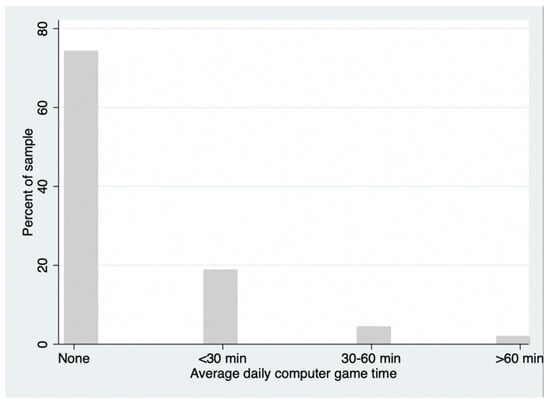 According to Table 1, adolescents played 0.69 h (or about 41 min) of video games per week, equivalent to about 6 min per day. Further breaking down the sample by daily video game time across different time thresholds (Figure 1, Appendix A Table A1), 75% of adolescents had no daily screen time at all, 19% of students had less than 30 min of screen time, 5% of adolescents had 30 to 60 min of screen time, and 2% of adolescents had daily video game time of over 60 min.