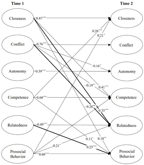 This study aimed to explore the reciprocal effects between teacher-student relationships, need satisfaction, and prosocial behavior. We applied the relationships motivation theory (RMT) within SDT to explain how teacher-student relationships predicted adolescents’ prosocial behavior over time by influencing students’ basic psychological need satisfaction (autonomy, competence, and relatedness satisfaction). RMT posits that the quality of interaction with important figures has a reciprocal relation with individuals’ satisfaction of basic psychological needs over time [], which, in turn, are related to adolescents’ social development. However, fewer studies have empirically validated this assumption. Thus, based on a full cross-lagged model, our results indicated that: (1) closeness has a reciprocal effect on adolescents’ prosocial behavior, and conflict has no significant effect on prosocial behavior; (2) closeness positively predicted competence and relatedness need satisfaction but not autonomy need satisfaction, whereas conflict negatively predicted all three psychological need satisfaction. Moreover, the bidirectional effects between competence and relatedness need satisfaction, and prosocial behavior were significant; (3) relatedness need satisfaction partially mediated the associations between both closeness and conflict and adolescents’ prosocial behavior. To our knowledge, this is the first study to examine the temporal relationships among these variables during adolescence, and the underlying mediating mechanism of basic need satisfaction in these relationships.