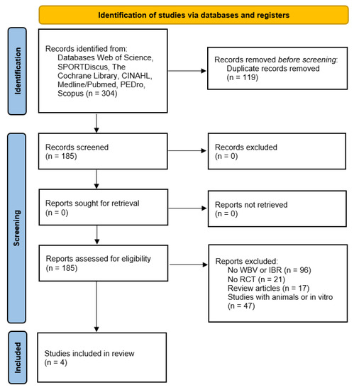 In total, 304 papers (Web of Science = 67, SPORTDiscus = 11, the Cochrane Library = 10, CINAHL = 14, Medline/PubMed = 137, PEDro = 5, Scopus = 60) were initially screened. A total of 119 records were identified as duplicates and removed. Ultimately, only four articles met the inclusion criteria. The selection process is schematized in the PRISMA flowchart [35] (Figure 1).