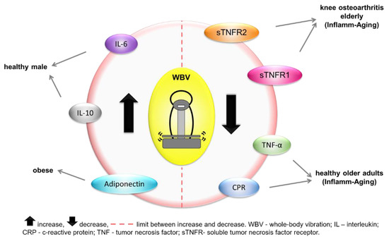 The present study details several IBRs and their relationships with conditions such as inflammaging and chronic diseases (i.e., KOA and obesity). Unfortunately, to the best of our knowledge, there are few studies on this subject. This makes the publication of this review relevant, as it shows the importance of conducting more studies investigating IBRs to WBV exercise.