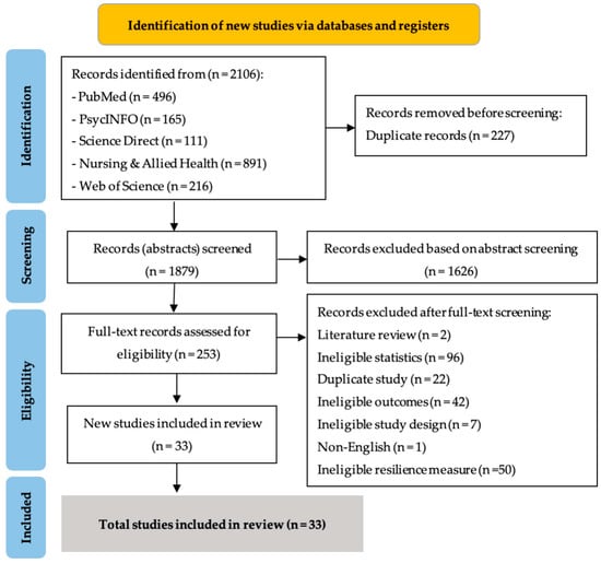 Following the literature search, all identified studies (N = 2106) found in PubMed (n = 496), Web of Science (n = 216), PsycINFO (n = 165), Science Direct (n = 111), and the Nursing and Allied Health Database (n = 891) were exported into EndNote X9 reference management software []. After duplicates were removed (n = 227), the 1879 remaining studies were exported into the Joanna Briggs Institute System for the Unified Management, Assessment, and Review of Information (JBI SUMARI) []. The researchers (TJ and WM) then independently screened their titles and abstracts in accordance with JBI SUMARI procedures based on selection criteria such as the publication language, participants, study design, and use of the CD-RISC self-report measure. After screening, 1626 ineligible records were excluded. The full texts of the 253 remaining articles were then retrieved for eligibility screening. During both title/abstract and full-text screening, discrepancies between two authors’ (TJ and WM) independent assessments were generally resolved through discussion. Finally, a total of 33 studies meeting the eligibility criteria were included in the review. The study selection process and reasons for excluding particular studies are shown in Figure 1.