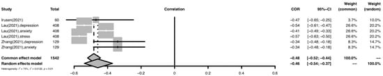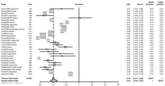 The inclusion criteria for the study were as follows: (1) a full-text journal article published in English; (2) original quantitative research focusing on the relationship between resilience and psychological distress, including depression, stress, anxiety, and PTSD, using correlational coefficients; and (3) use of self-reported measurement of resilience with the Connor–Davidson Resilience Scale (CD-RISC), which is the scale most widely used to assess psychological resilience. This instrument focuses on resources that can help individuals to recover from and adapt to disruptions or stressful events such as the COVID-19 crisis. We did not include studies using the Brief Resilience Scale (BRS), which directly measures one’s ability to bounce back or be resilient but does not consider external resources []. In addition, although other resilience instruments have been applied in resilience studies, the various theoretical constructs and frameworks of resilience underpinning these instruments were not suitable for conducting our meta-analysis due to heterogeneity issues. Furthermore, we excluded sources if they (1) reported studies of other infectious diseases related to epidemics or pandemics (e.g., SARS or MERS); (2) were review or interventional studies; or (3) were gray literature, books, abstracts, or study protocols.