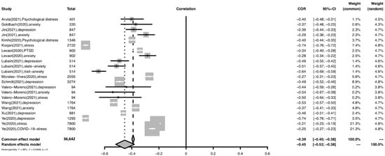 Pooled analysis revealed that overall resilience was significantly negatively correlated with psychological distress among healthcare providers (pooled r = −0.39; 95% CI: −0.44 to −0.33; p < 0.001); however, the correlation was lower than pre-pandemic (r = −0.61) []. Studies reported that resilience was significantly negatively related to psychological distress among female nurses [] and rescue workers []. A possible explanation for this association is that resilience can emerge as the ability to take full advantage of their positive personal characteristics despite stressful occupational circumstances. Moreover, healthcare providers’ experiences in providing care for COVID-19 patients and their family members, their access to expert colleagues and resources, their psychological knowledge, and their relatively high level of education [] may help them to cope with psychological distress.