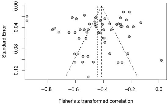 The funnel plot for publication bias is provided in Figure 5. Based on publication bias analysis, visual evaluation of the funnel plot revealed that the distribution of the studies deviated from the funnel, which one would normally expect in the absence of publication bias. Therefore, this figure provides no visual indication of skewedness of the effect sizes observed. The left-sided test for funnel plot asymmetry using Egger’s regression test was not significant (p = 0.179), supporting the conclusion that no significant publication bias was present.