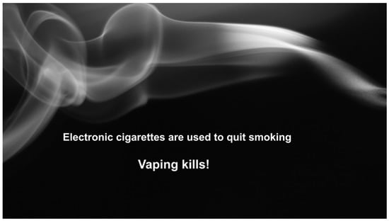 Stimuli were created based on the images used by Minton and Gardiner []. The messages for the experimental groups appealed to the moral foundations of harm/care, regarded as fundamental and universal in moral psychology by most theoretical perspectives (e.g., [,]). The message for the control condition was a short text in Latin, a place-holder text usually employed in typesetting at least since the 1960s, without any particular meaning []. We chose not to use a vaping-related neutral message to the control group because we wanted to avoid any type of priming since previous research has indicated that e-cigarette use may have been moralized in the general Romanian population []. All participants were asked to assess, on a scale from 1 to 5, the extent to which they considered that the font type, the colors, and the background were fit for public health messages.