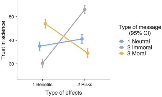 We found statistically significant differences in trust in science according to the type of effects (F(1, 603) = 37.118, p < 0.001, η2p = 0.058), type of message (F(2, 603) = 4.436, p = 0.012, η2p = 0.014), and, respectively, the interaction term between them (F(2, 603) = 194.098, p < 0.001, η2p = 0.392).