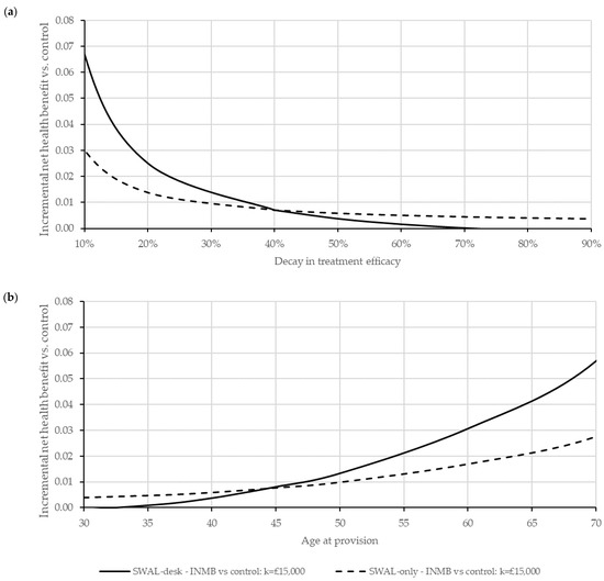 Sensitivity analyses: (a) Incremental net health benefits for alternative treatment decay profiles at a cost-effectiveness threshold of £15,000 per QALY; (b) Incremental net health benefits for alternative age profiles at a cost-effectiveness threshold of £15,000 per QALY.